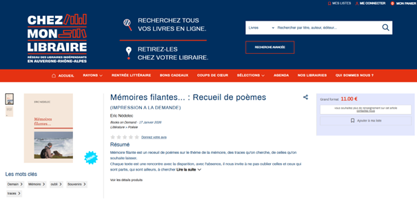https://www.chez-mon-libraire.fr/livre/9782322577866-memoires-filantes-recueil-de-poemes-eric-nedelec/?fbclid=IwY2xjawPwJwNleHRuA2FlbQIxMQBzcnRjBmFwcF9pZBAyMjIwMzkxNzg4MjAwODkyAAEen7PMNeU5Yr_E2F6HmFweEhkBnp2Fm1a3-DJmnrdIKC5O4OBeMaiBvJzsJsk_aem_QjBhtnyWh3PZAi9DQBOvWQ